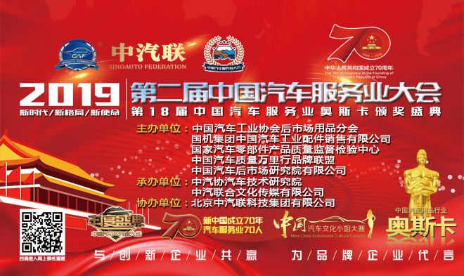 為貫徹落實黨的十九大精神,認真貫徹落實《國務(wù)院辦公廳關(guān)于加快發(fā)展流通促進商業(yè)消費的意見》(國辦發(fā)〔2019〕42號),激發(fā)和保護企業(yè)家精神,壯大企業(yè)家隊伍,增強企業(yè)家信心,進一步推動經(jīng)濟新常態(tài)下我國汽車企業(yè)加快發(fā)展方式轉(zhuǎn)變,實現(xiàn)可持續(xù)發(fā)展,在國家有關(guān)部委指導(dǎo)下,由中國汽車工業(yè)協(xié)會后市場用品分會、國機集團中國汽車工業(yè)配件銷售公司、國家汽車零部件產(chǎn)品質(zhì)量監(jiān)督檢驗中心、中國汽車后市場研究院有限公司等機構(gòu)主辦的以“新時代、新格局、新使命”為主題的2019中國汽車服務(wù)業(yè)大會暨第18屆中國汽車服務(wù)業(yè)奧斯卡頒獎盛典將于2019年12月盛大舉行。