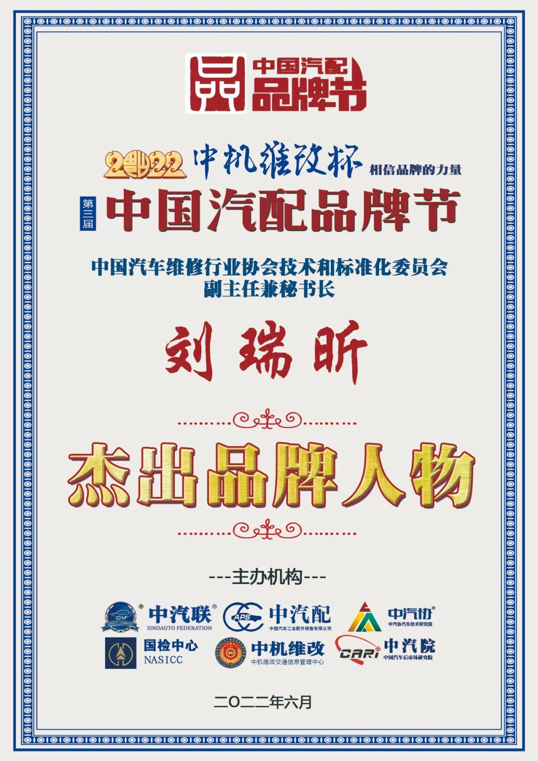 中國(guó)汽車(chē)維修行業(yè)協(xié)會(huì)技術(shù)和標(biāo)準(zhǔn)化委員會(huì)副主任兼秘書(shū)長(zhǎng)劉瑞昕榮膺2022中國(guó)汽配行業(yè)杰出品牌人物大獎(jiǎng)!