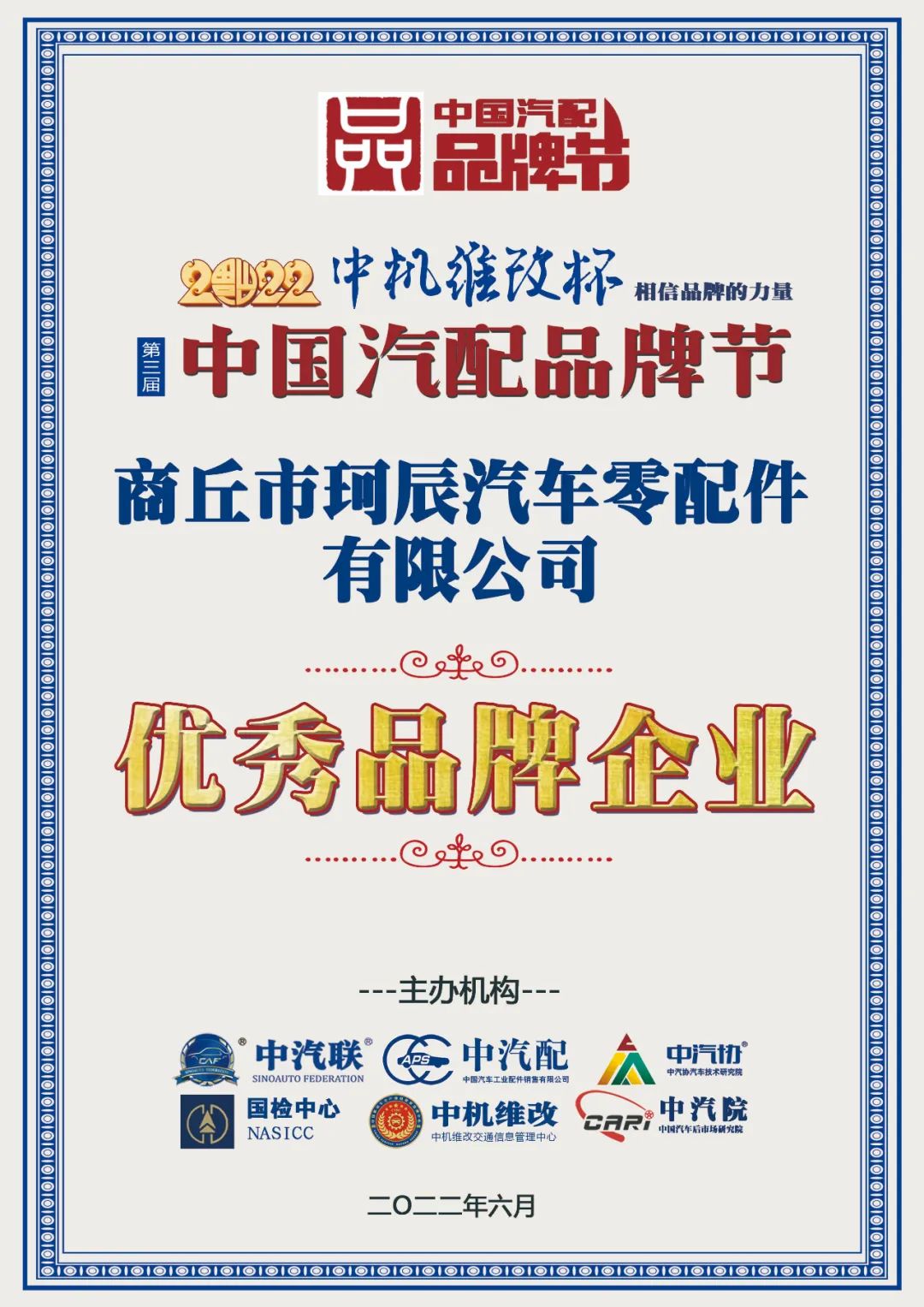 商丘珂辰榮膺2022中國汽配行業(yè)優(yōu)秀品牌企業(yè)大獎!