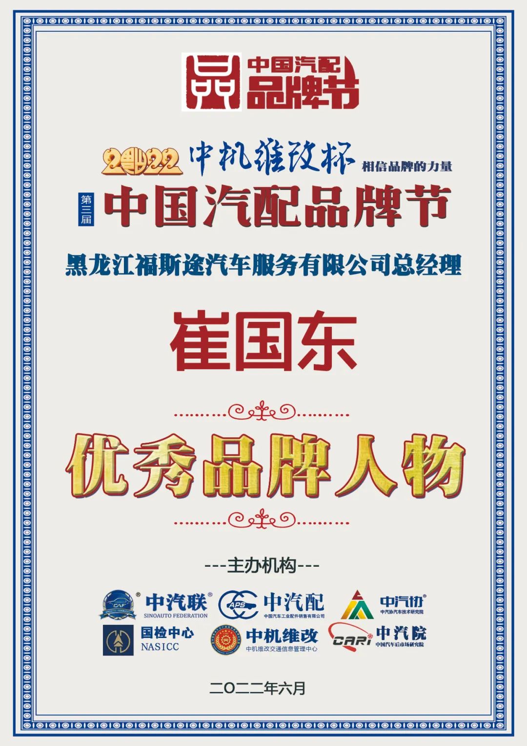 據(jù)《2022中國(guó)汽配品牌榜》榜單顯示:黑龍江福斯途汽車服務(wù)有限公司總經(jīng)理崔國(guó)東榮膺“2022中國(guó)汽配行業(yè)優(yōu)秀品牌人物”大獎(jiǎng)。