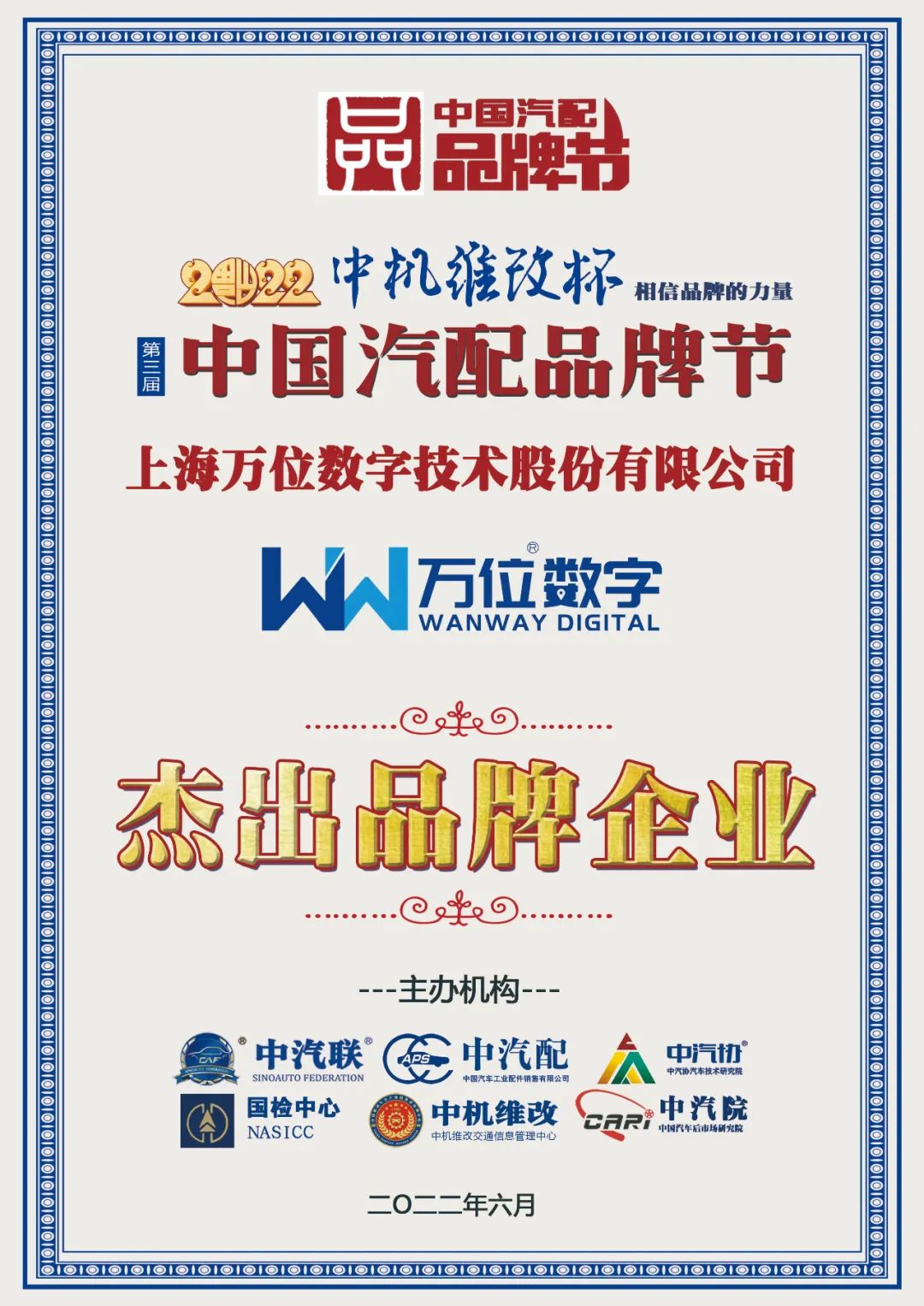 上海萬(wàn)位數(shù)字榮膺2022中國(guó)汽配杰出品牌企業(yè)大獎(jiǎng)