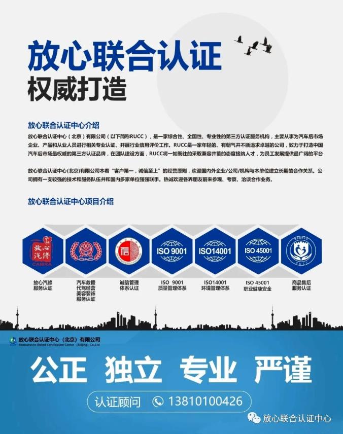 放心聯(lián)合認(rèn)證中心(北京)有限公司是經(jīng)國家認(rèn)證認(rèn)可監(jiān)督管理委員會批準(zhǔn),在北京工商行政管理局注冊的企業(yè)法人,本中心成立于2016年。是國內(nèi)最早批準(zhǔn)具有服務(wù)認(rèn)證資質(zhì)的第三方認(rèn)證機(jī)構(gòu) 。其“放心汽修”服務(wù)認(rèn)證在國內(nèi)具有權(quán)威性。