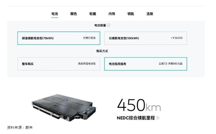 在其電池更換業(yè)務(wù)的基礎(chǔ)上,蔚來推出了 "電池租用服務(wù)",讓客戶可以選擇購買一輛沒有電池的汽車。這種結(jié)構(gòu)將汽車的總價格降低了至少7萬元人民幣,并被認(rèn)為是為了提高電動汽車的采用率。