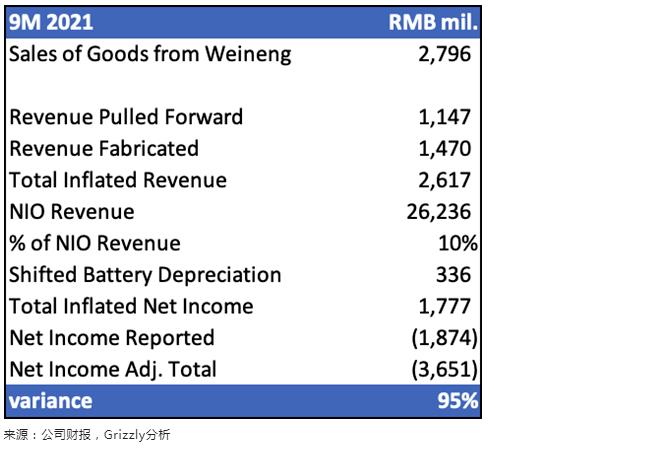 通過向蔚能過度供應(yīng)電池和提前拉動收入,蔚來在截至2021年9月的9個月里,虛報了26億元人民幣的收入(約占該時期收入的10%)。更糟糕的是,該期間應(yīng)報告的凈虧損為36億元人民幣,這是蔚來實(shí)際報告虧損的兩倍。
