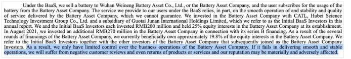 “2020年8月,本集團(tuán)與其他三位第三方投資者共同成立了電池資產(chǎn)公司。本集團(tuán)向電池資產(chǎn)公司投資人民幣20萬元,持有電池資產(chǎn)公司25%的股權(quán)。2020年12月,電池資產(chǎn)公司與其他第三方投資者簽訂協(xié)議,由這些投資者追加投資,共計人民幣640,000元。2021年,本集團(tuán)進(jìn)一步向電池資產(chǎn)公司投資人民幣27萬元,投資完成后,本集團(tuán)擁有電池資產(chǎn)公司約19.8%股權(quán)。本集團(tuán)作為電池資產(chǎn)公司的主要股東,有權(quán)任命電池資產(chǎn)公司董事會九名董事中的一名擔(dān)任董事,并能對電池資產(chǎn)公司行使重大影響。因此,對電池資產(chǎn)公司的投資采用以下方法核算‘權(quán)益法‘。”