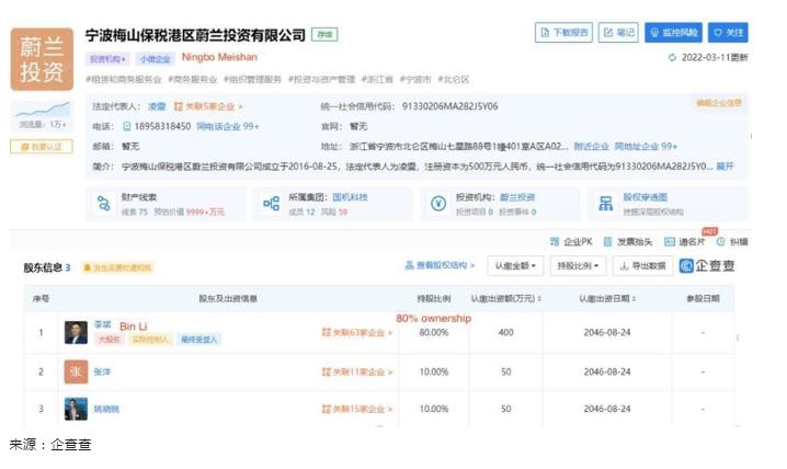 據(jù)企查查,寧波梅山公司成立于2016年8月,業(yè)務(wù)范圍包括投資咨詢和管理。股東信息顯示,蔚來的董事長李斌擁有寧波梅山80%的股份,使他成為這些無息貸款的直接受益人。