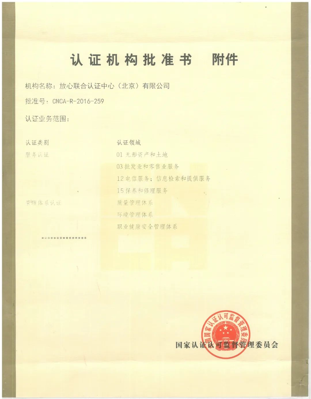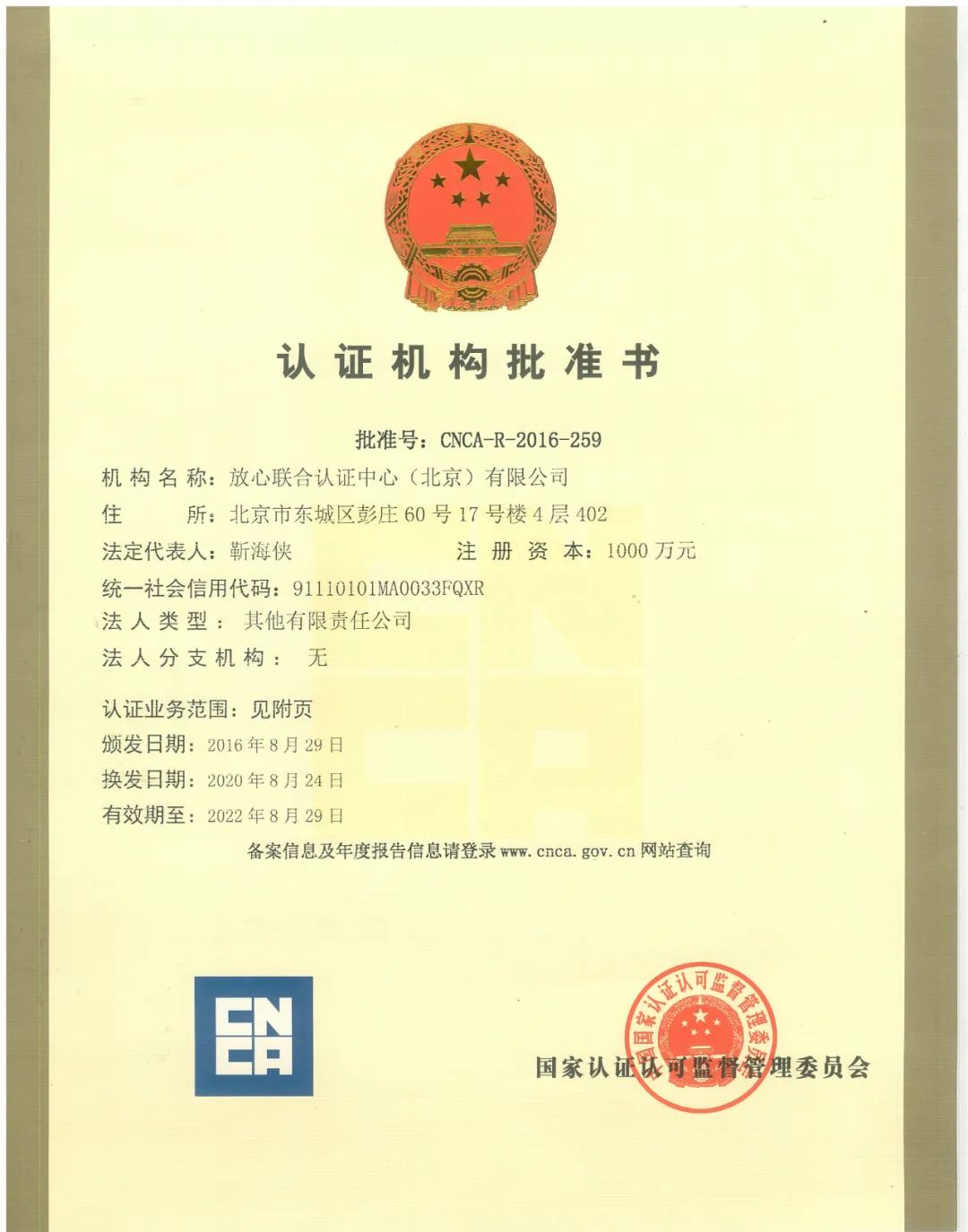 放心聯(lián)合認(rèn)證中心(北京)有限公司是經(jīng)國(guó)家認(rèn)證認(rèn)可監(jiān)督管理委員會(huì)批準(zhǔn),在北京工商行政管理局注冊(cè)的企業(yè)法人,本中心成立于2016年。是國(guó)內(nèi)最早批準(zhǔn)具有服務(wù)認(rèn)證資質(zhì)的第三方認(rèn)證機(jī)構(gòu) 。其“放心汽修”服務(wù)認(rèn)證在國(guó)內(nèi)具有權(quán)威性。