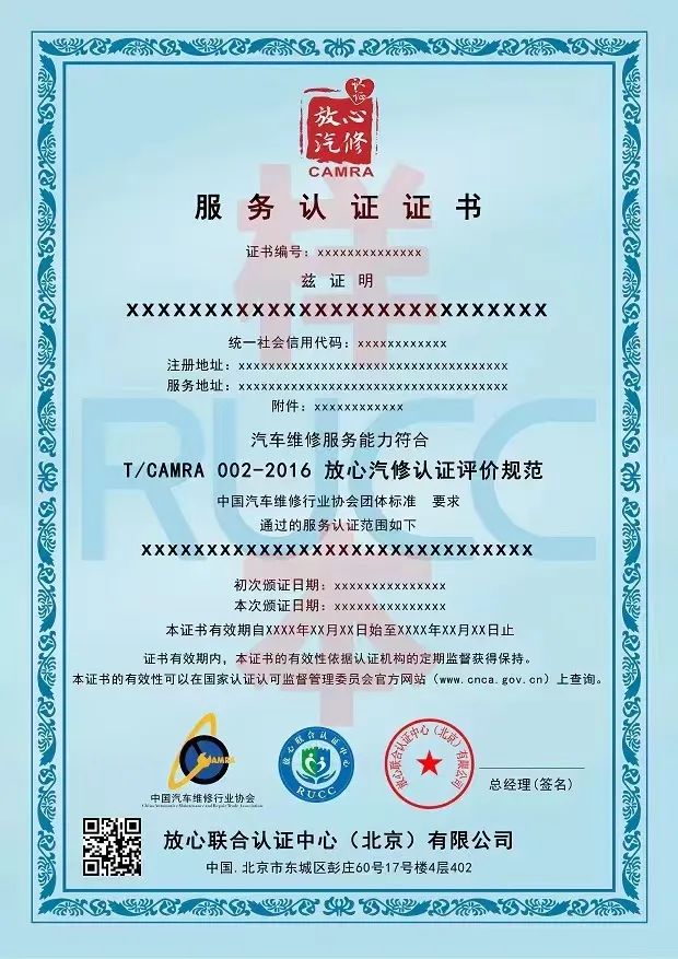 放心汽修服務(wù)認(rèn)證證書(shū)式樣