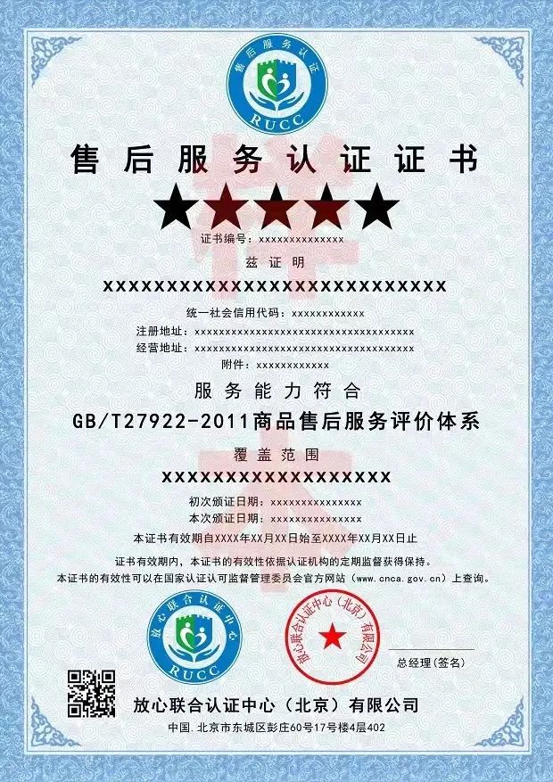 售后服務(wù)認(rèn)證證書(shū)式樣