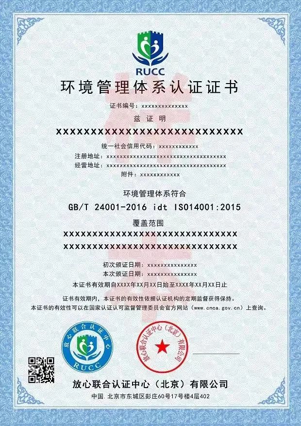 環(huán)境管理體系認(rèn)證證書(shū)式樣