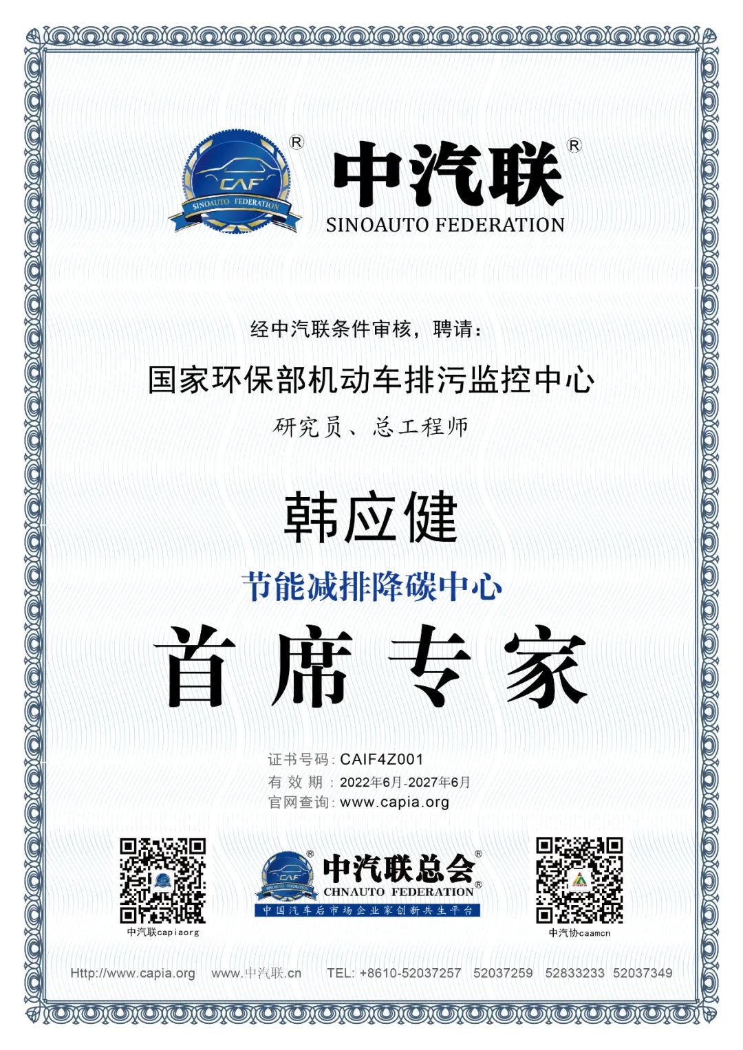 近日,經(jīng)中汽聯(lián)理事會推薦,中汽聯(lián)專家委員會審核,節(jié)能減排降碳中心批準,正式聘請國家環(huán)境保護部機動車排污監(jiān)控中心研究員、總工程師韓應健擔任“節(jié)能減排降碳中心首席專家”。