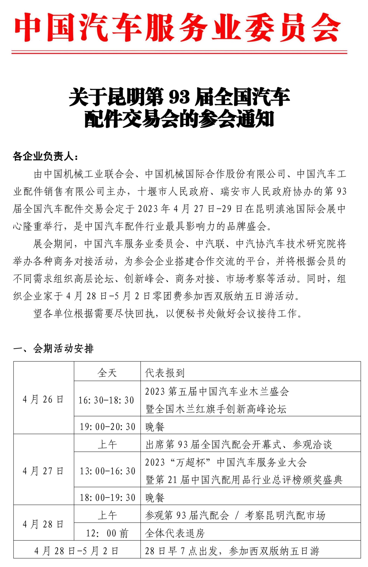 關(guān)于昆明第93屆全國(guó)汽車配件交易會(huì)的參會(huì)通知