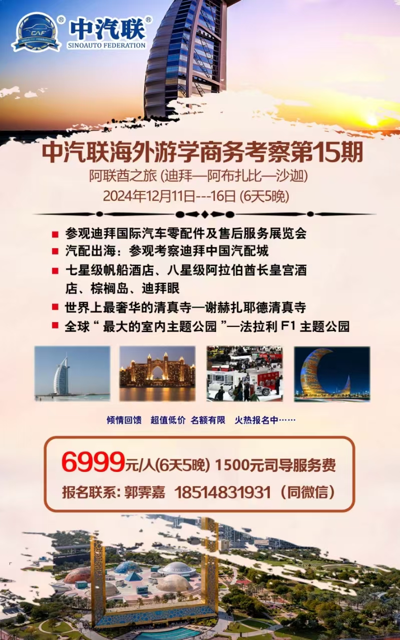中汽聯(lián)已成功組織14期國外游學商務考察,曾帶領500多名企業(yè)家到40多個國家商務游學,得到參與者的一致好評,已成為汽配企業(yè)出海、商務游學的知名品牌活動。為加強中阿兩國汽車后市場的交流與合作,學習阿聯(lián)酋的先進技術與管理經(jīng)驗,提升我國汽車市場的整體管理水平,中汽聯(lián)、中汽協(xié)汽車技術研究院應迪拜國際汽車零配件及售后服務展覽會