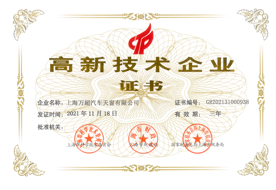 熱烈祝賀上海萬超汽車天窗有限公司榮膺上海市《高新技術企業(yè)》榮譽稱號