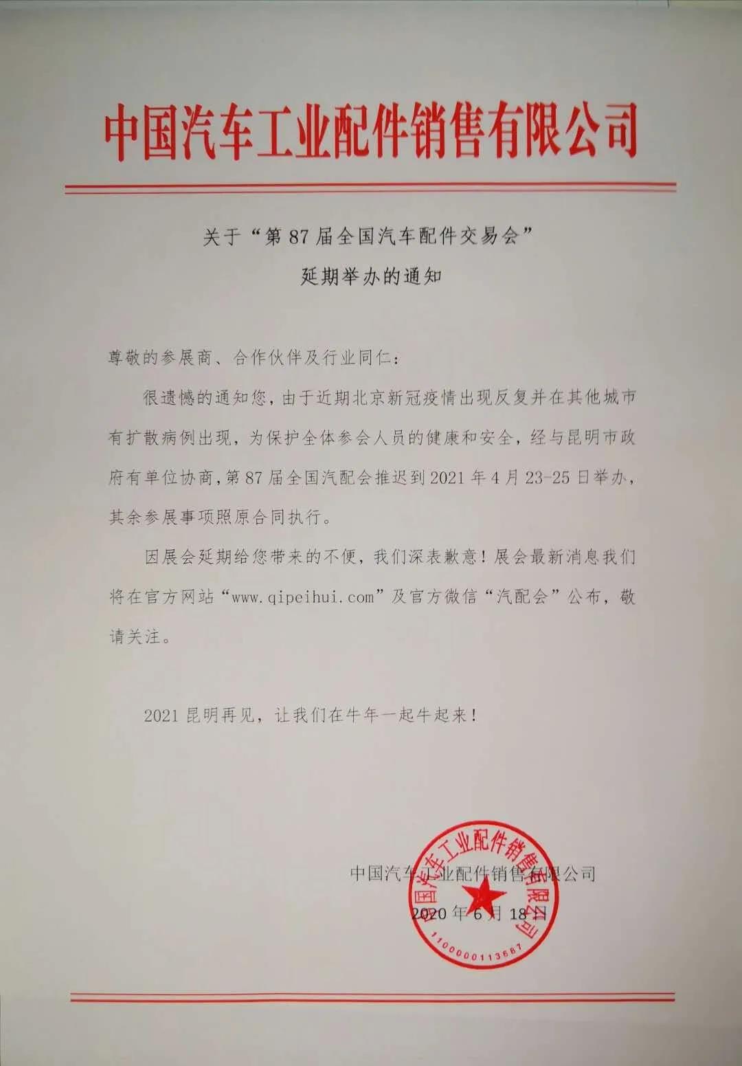 原定于2020年7月6日-7月8日,由中國機(jī)械工業(yè)聯(lián)合會(huì)、中國機(jī)械國際合作股份有限公司、中國汽車工業(yè)配件銷售有限公司主辦的“第87屆全國汽車配件交易會(huì)”應(yīng)政府要求,因疫情及不可抗力等客觀因素,經(jīng)主辦單位認(rèn)真考慮,認(rèn)為生命安全重于一切,絕不給國家添亂,即使面臨巨大的困難和損失,毅然決定延至2021年4月23-25日,繼續(xù)在昆明滇池國際會(huì)展中心舉辦。