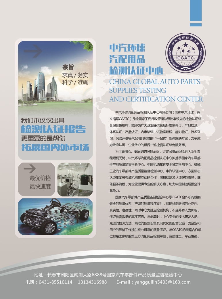 中汽環(huán)球汽配用品檢測(cè)認(rèn)證中心以“求真、務(wù)實(shí)、科學(xué)、準(zhǔn)確”為宗旨,堅(jiān)持“最優(yōu)價(jià)格、最快速度”的服務(wù)品質(zhì),急客戶所急,想客戶所想,和企業(yè)一起見證中國發(fā)展,協(xié)助中國產(chǎn)品暢銷全球。