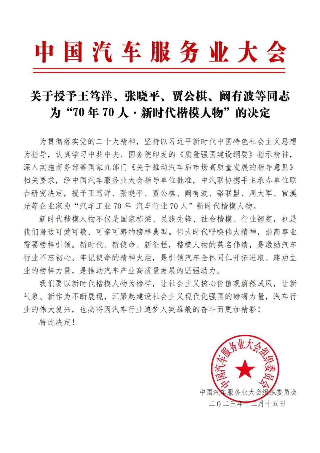 汽車行業(yè)70年70人新時(shí)代楷模人物榜單