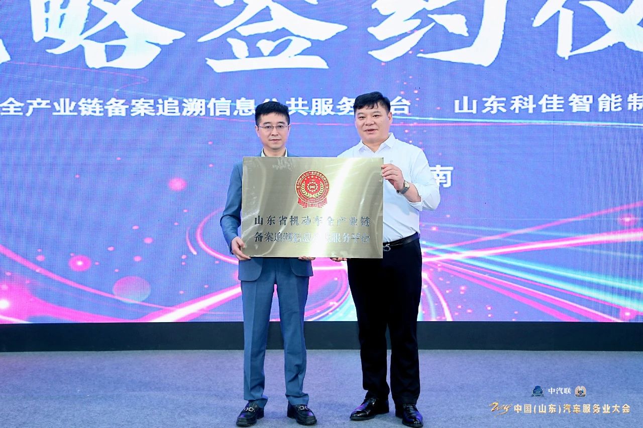 在中國(guó)汽車工業(yè)委員會(huì)會(huì)長(zhǎng)王篤洋,濟(jì)南新材料產(chǎn)業(yè)園區(qū)管委會(huì)主任韓利師,濟(jì)南市天橋區(qū)副區(qū)長(zhǎng)劉志華,濟(jì)南新材料產(chǎn)業(yè)園區(qū)管委會(huì)副主任張良通,濟(jì)南新材料產(chǎn)業(yè)園區(qū)管委會(huì)副主任于業(yè)輝等領(lǐng)導(dǎo)的見(jiàn)證下,中國(guó)機(jī)動(dòng)車全產(chǎn)業(yè)鏈備案追溯中心主任趙幸芝與山東科佳智能制造集團(tuán)有限公司董事長(zhǎng)方子盛簽訂戰(zhàn)略合作協(xié)議。