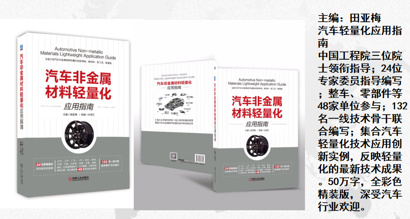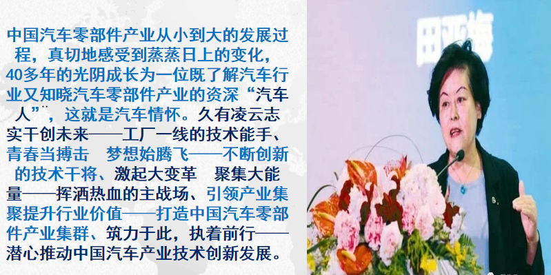 她是中國汽車零部件產(chǎn)業(yè)發(fā)展的見證者和推動者,中國汽車零部件領(lǐng)軍人物,她是了解汽車行業(yè)又知曉汽車零部件的資深“汽車人”。2019年,她主編出版《鑒•新》汽車非金屬材料輕量化應(yīng)用指南指導(dǎo)性的技術(shù)書籍,這本書是對汽車工業(yè)產(chǎn)業(yè)創(chuàng)新發(fā)展的巨大貢獻,也是對新中國成立70周年的獻禮之作。