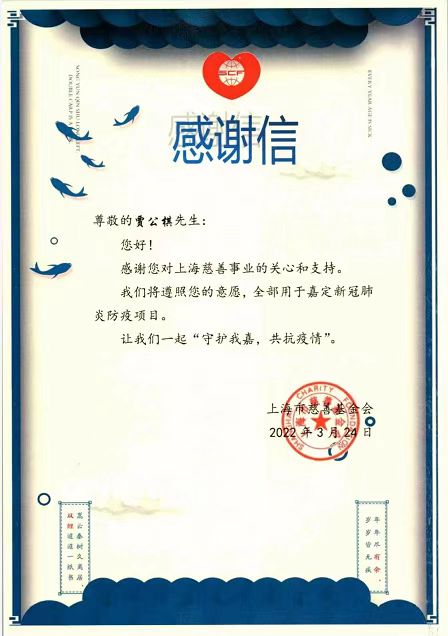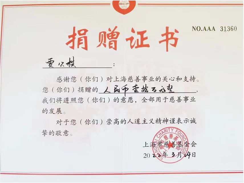 近日來(lái),全國(guó)疫情形勢(shì)復(fù)雜,社會(huì)各界全力以赴,眾志成城,科學(xué)有序地持續(xù)開(kāi)展新冠肺炎疫情聯(lián)防聯(lián)控工作,打響了一場(chǎng)勇毅而溫情的抗議防控狙擊戰(zhàn)。為了更好的弘揚(yáng)社會(huì)風(fēng)氣和正能量,大力宣傳我國(guó)一方有難,八方支援的優(yōu)良傳統(tǒng)文化,充分發(fā)揮企業(yè)家精神,2022年3月,賈公棋向溫州捐款10萬(wàn)元人民幣,向上海市慈善基金會(huì)捐贈(zèng)10萬(wàn)元整用于前線(xiàn)醫(yī)護(hù)人員,公安干警,抗疫自愿者的慰問(wèn)和助力新冠肺炎防疫項(xiàng)目。