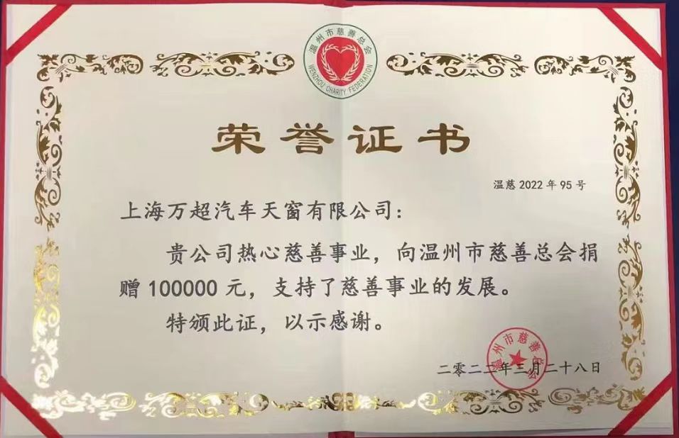 創(chuàng)建誠(chéng)信經(jīng)營(yíng)準(zhǔn)則和企業(yè)與員工的行為規(guī)范、打造企業(yè)領(lǐng)導(dǎo)率先垂范立誠(chéng)守信平臺(tái)、建立誠(chéng)信獎(jiǎng)罰考核機(jī)制……近年來(lái),上海萬(wàn)超汽車(chē)天窗有限公司始終堅(jiān)持“一切為了用戶(hù)”的經(jīng)營(yíng)理念,以誠(chéng)經(jīng)營(yíng),惜諾如金,篤信誠(chéng)信是企業(yè)的生命。堅(jiān)持以為用戶(hù)提供優(yōu)質(zhì)產(chǎn)品、優(yōu)質(zhì)服務(wù)為己任,在不斷變換的市場(chǎng)中取得了不凡的業(yè)績(jī),同時(shí)也贏(yíng)得了社會(huì)各界的廣泛好評(píng)。