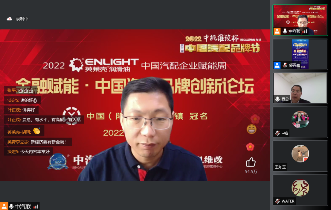 2022年5月16日,“2022 英萊殼杯 中國(guó)汽配品牌賦能周”的首場(chǎng)活動(dòng),由中國(guó)(陽(yáng)谷)車品小鎮(zhèn)特約冠名的“金融賦能 · 2022中國(guó)汽配品牌創(chuàng)新論壇”在線上成功舉行,銀杏資本管理有限公司高級(jí)合伙人陳碩 、北京東方大澤投資有限公司創(chuàng)始合伙人史蕓菁、云南國(guó)際信托家族信托部總經(jīng)理助理王波、金盒集團(tuán)金融資本總裁、中汽聯(lián)首席數(shù)字經(jīng)濟(jì)專家戴浦臣 、汽車產(chǎn)業(yè)創(chuàng)業(yè)與創(chuàng)投平臺(tái)——車創(chuàng)投創(chuàng)始人賈永軒等五位金融界大咖書長(zhǎng)作為嘉賓做了精彩分享,得到了眾多汽配企業(yè)家的關(guān)注,點(diǎn)贊量達(dá)到了550000個(gè)。金融賦能論壇由中汽聯(lián)執(zhí)行會(huì)長(zhǎng)、中汽協(xié)汽車技術(shù)研究院院長(zhǎng)喬永鋒主持。