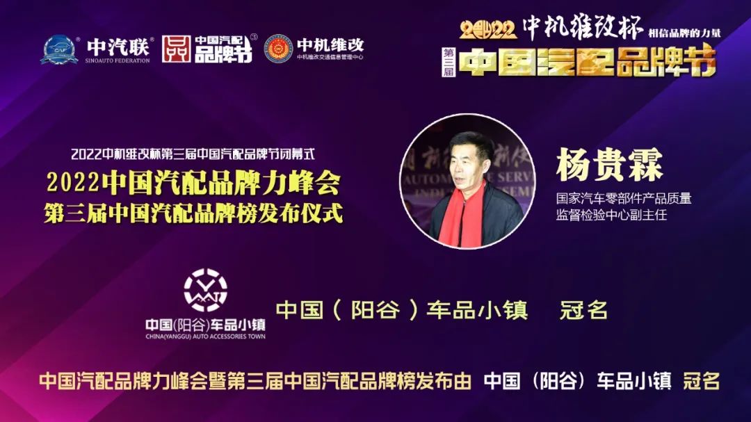 國家汽車零部件產(chǎn)品質(zhì)量監(jiān)督檢驗中心副主任、中汽環(huán)球汽配用品檢測認(rèn)證中心主任、中國汽配品牌節(jié)組委會主任楊貴霖 出席2022中國汽配品牌力峰會并致辭。楊主任指出:黨中央、國務(wù)院高度重視品牌建設(shè),從設(shè)立“中國品牌日”,再到“十四五規(guī)劃”明確提出“開展中國品牌創(chuàng)建行動”,我國品牌建設(shè)正迎來春天,這與中國汽配品牌節(jié)的初心完全吻合,也是踐行強(qiáng)國品牌戰(zhàn)略的實際行動。