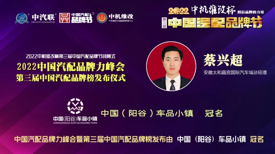 安徽太和晶宮國際汽車城總經(jīng)理蔡興超 出席2022中國汽配品牌力峰會并做了精彩分享。晶宮國際汽車城注重城市功能、生態(tài)功能與產(chǎn)業(yè)功能的融合,結(jié)合周邊的自然資源、文化資源、旅游資源和社會資源,打造汽車產(chǎn)業(yè)及文化產(chǎn)業(yè)相結(jié)合的汽車類商業(yè)新模式,帶動太和縣就業(yè)和推動中小企業(yè)發(fā)展,促進(jìn)縣域經(jīng)濟(jì)和汽車文化又好又快發(fā)展。