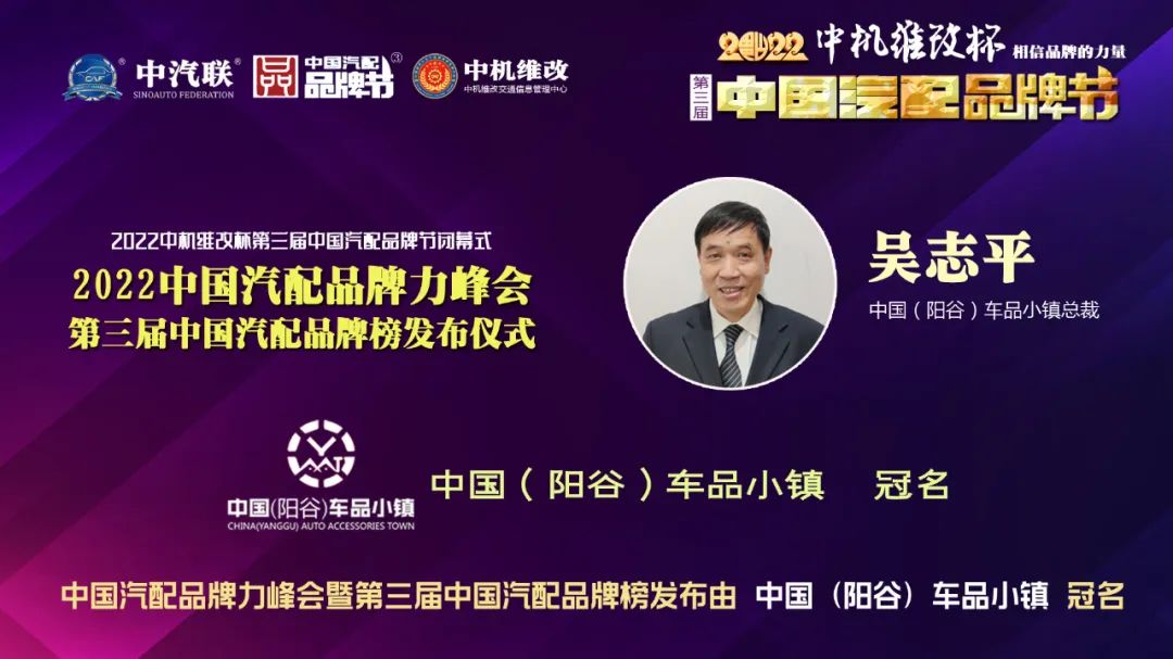 中汽聯(lián)商業(yè)地產(chǎn)委員會常務(wù)副會長兼秘書長、中國(陽谷)車品小鎮(zhèn)總裁吳志平 出席2022中國汽配品牌力峰會并做了精彩分享。中國(陽谷)車品小鎮(zhèn)是由中汽聯(lián)高標(biāo)準(zhǔn)謀劃、陽谷縣人民政府主導(dǎo)、陽谷車品小鎮(zhèn)發(fā)展有限公司實施的山東省、聊城市、陽谷縣三級政府“雙招雙引”的重點項目,也是2021年山東省重大項目;吳總指出陽谷車品小鎮(zhèn)按照“2022年打基礎(chǔ)、2023年見成效、2025年成規(guī)模”的發(fā)展思路,五年內(nèi)計劃入駐中小企業(yè)近千家,安排就業(yè)人員2萬多人,力爭在“十四五”期間,形成百億元級產(chǎn)業(yè)基地,打造全國領(lǐng)先的專業(yè)汽車配件用品制造和集散中心。